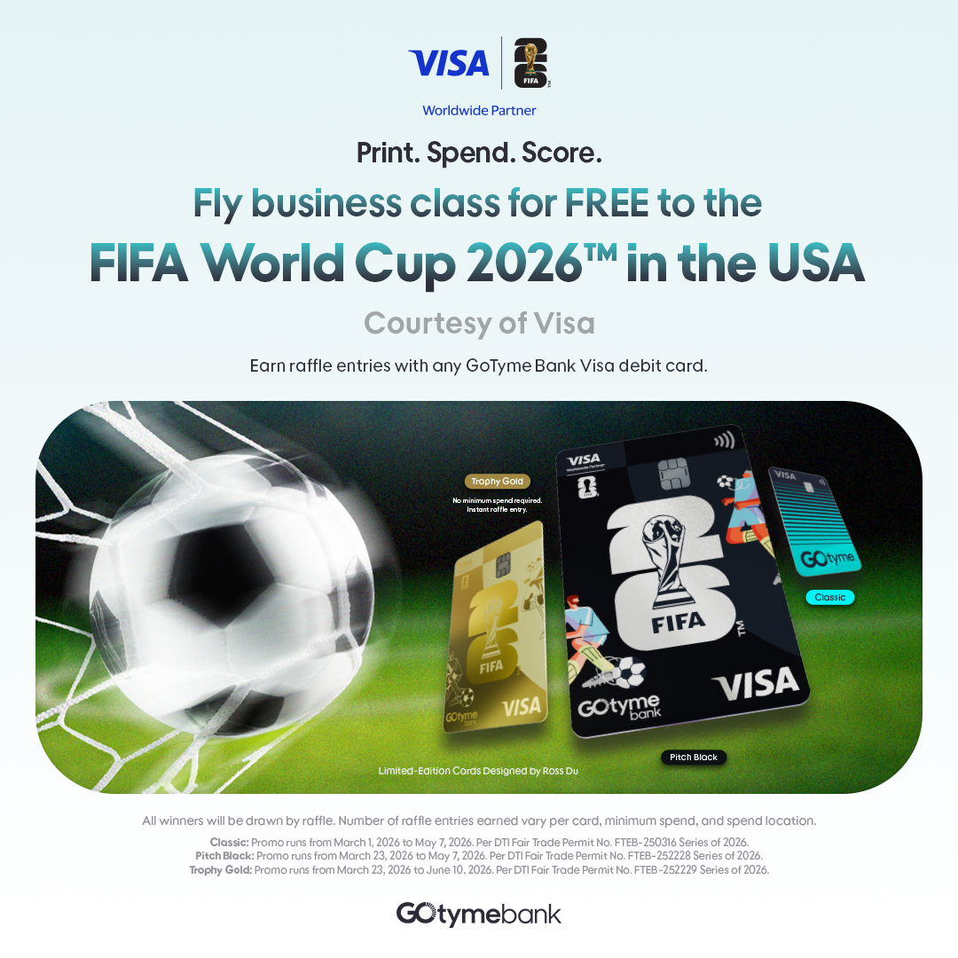 Get your FIFA World Cup 2026™ x GoTyme Bank Limited Edition Visa Debit Card at any GoTyme Bank Visa FIFA World Cup 2026™ kiosk starting March 23, 2026. Visit our website for the full promo mechanics and details, and follow @gotymebank on social media for the latest updates.